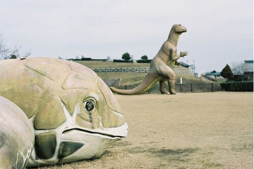 潮風の丘とまり Kodak PORTRA160 日本海に面した丘の上にあるグランドゴルフ場です。 あくまで、グランドゴルフ場なのですが、何故か広場には恐竜の模型が。 さらに、奥にはもっと多くの模型のある"探検の森"や"恐竜食堂"なるものも。 謎コンセプトですが、…